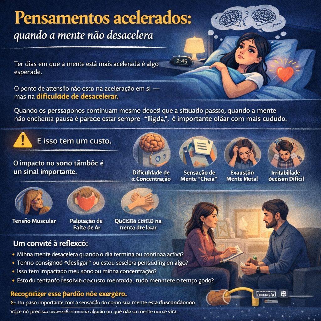 Pensamentos acelerados ocasionais, ligados a situações específicas, fazem parte da vida. Mas, quando se tornam constantes e começam a afetar seu bem-estar, seu sono e seu funcionamento, deixam de ser apenas um momento passageiro.